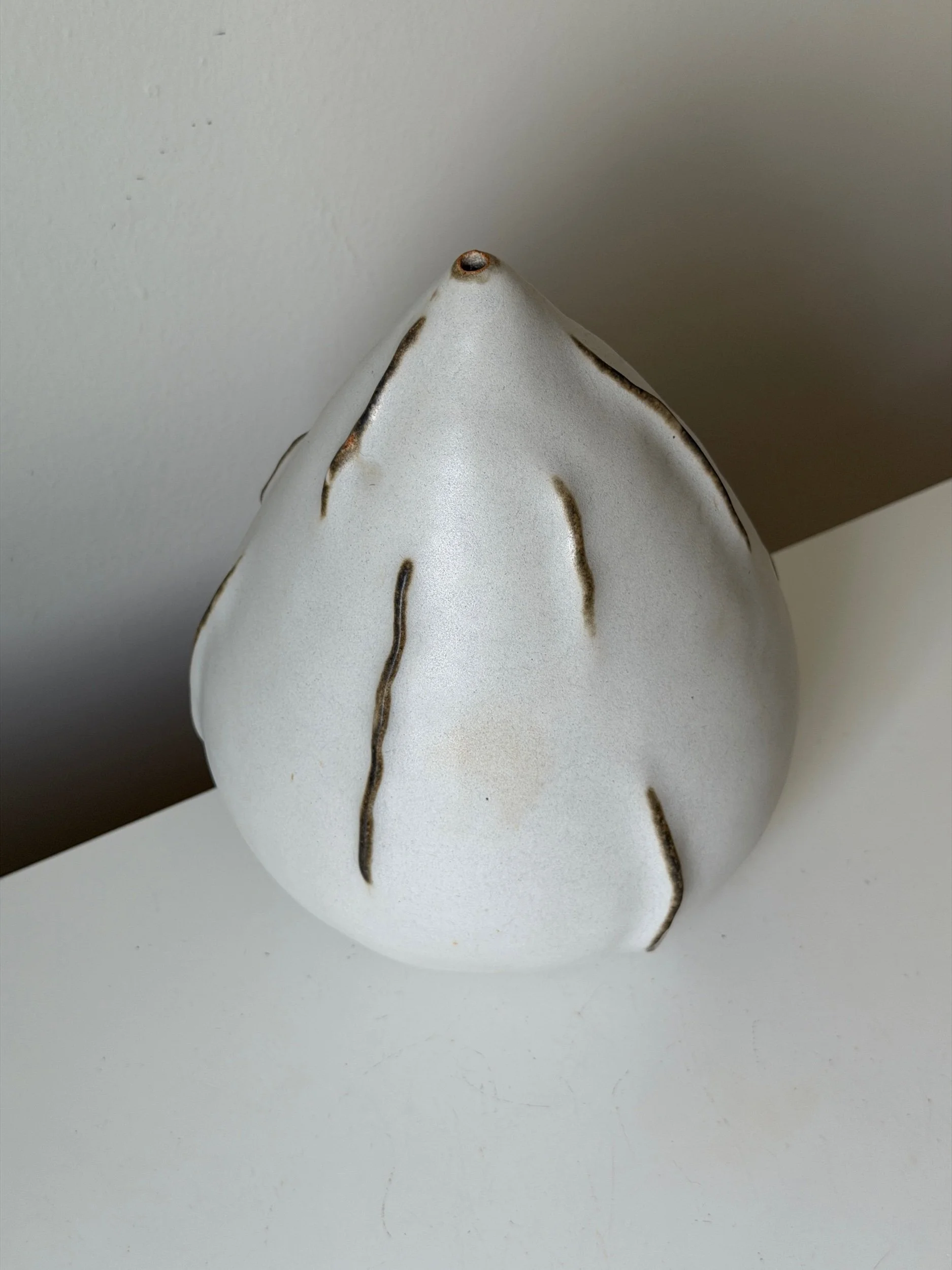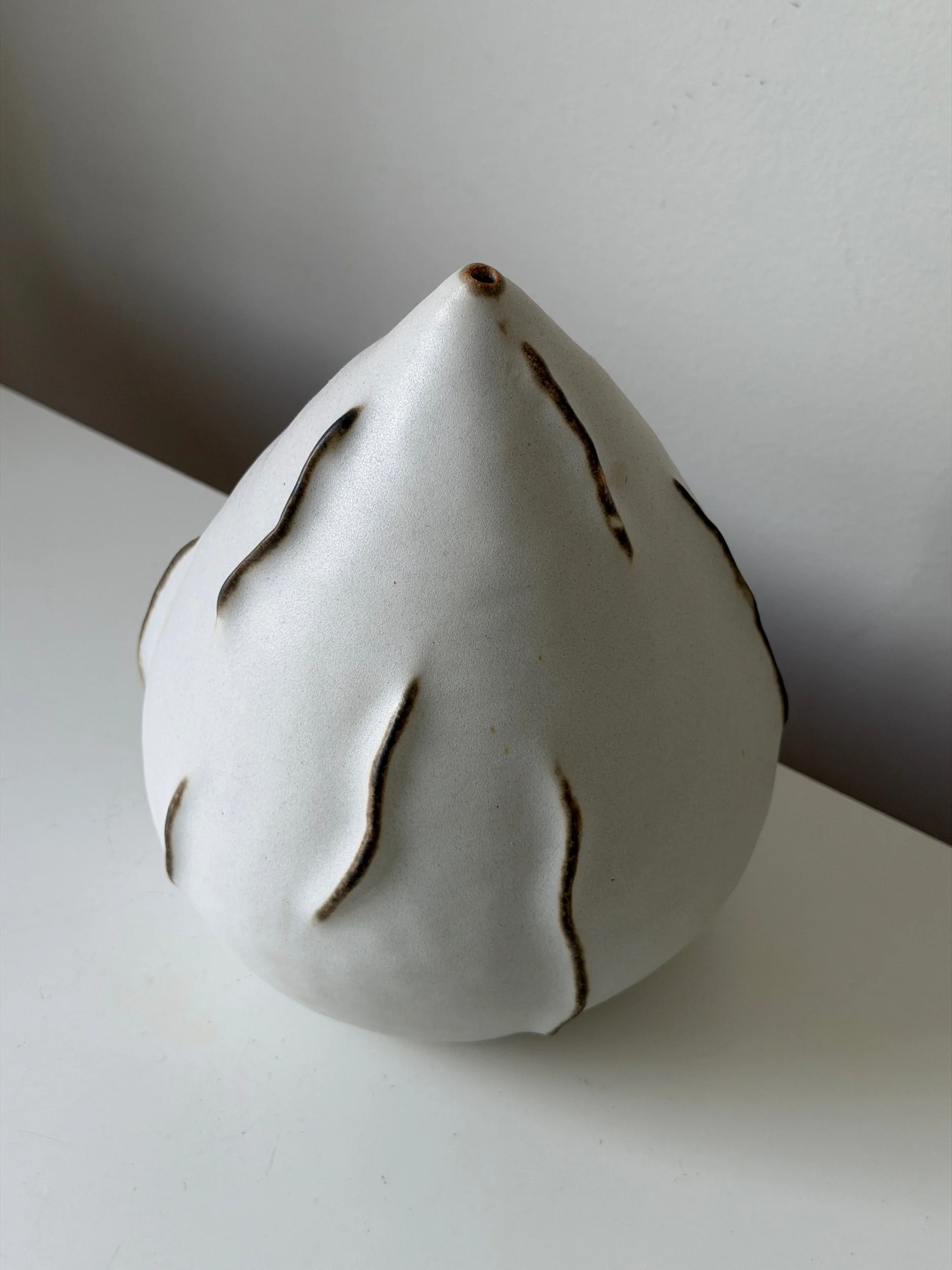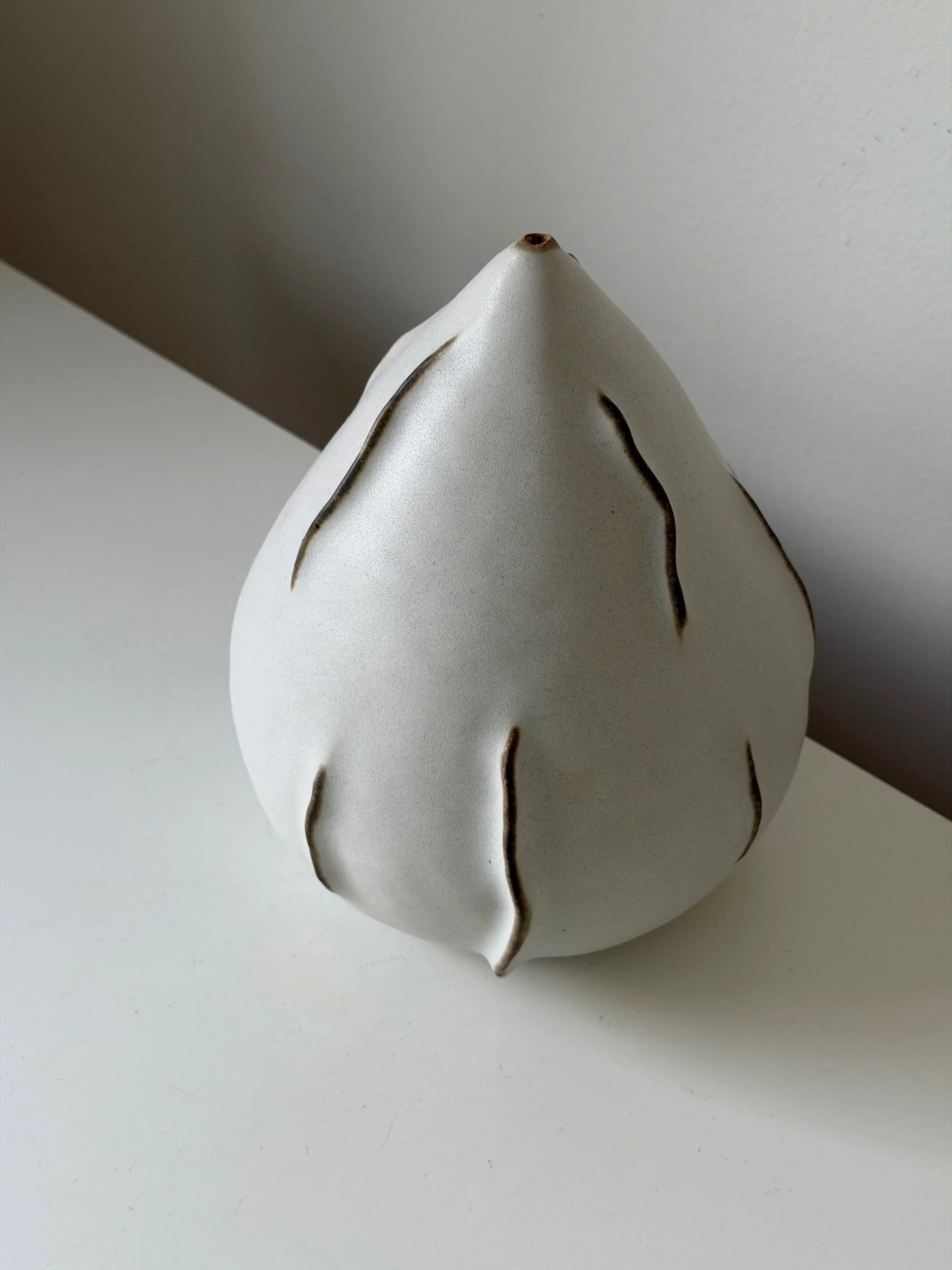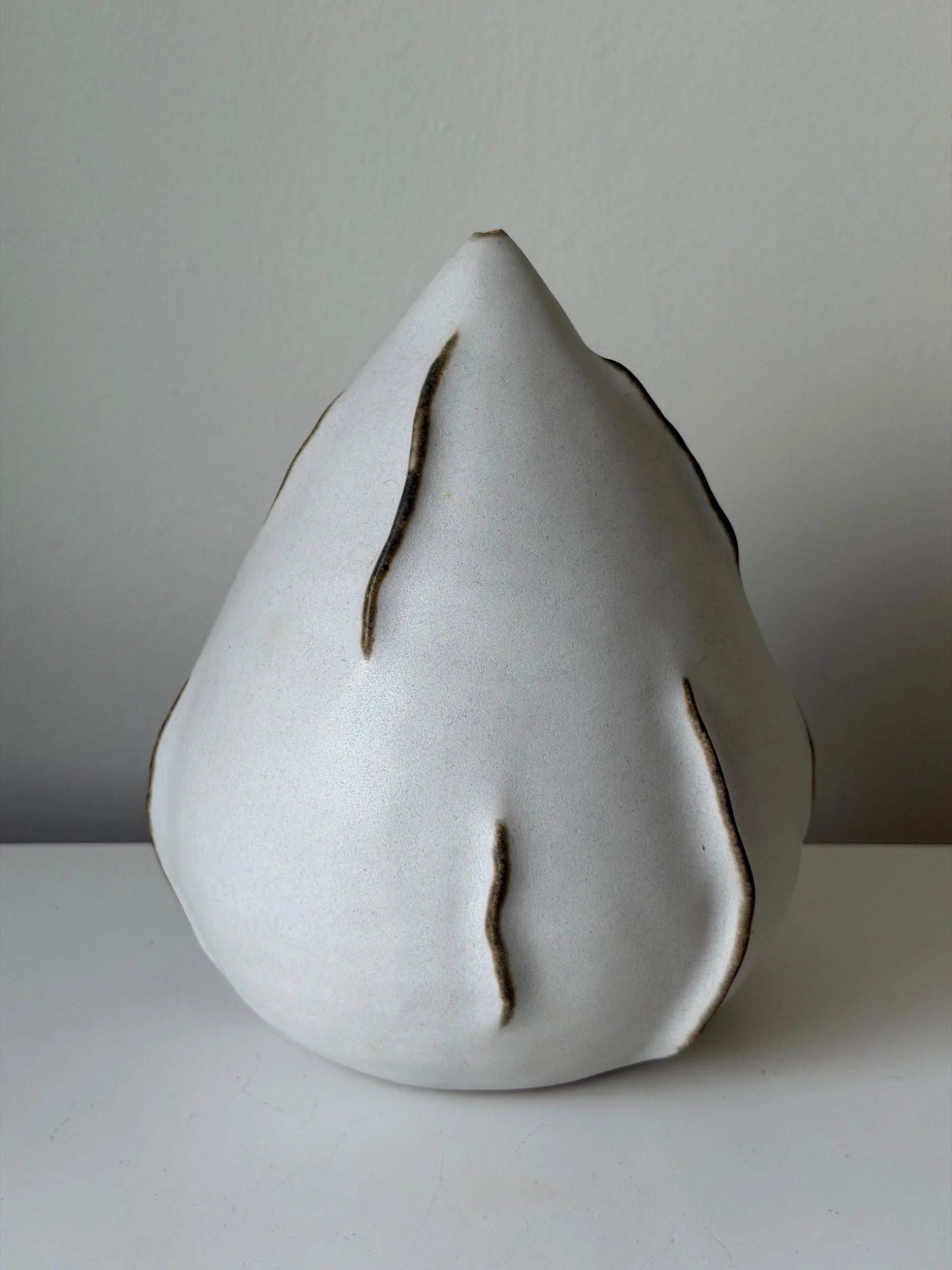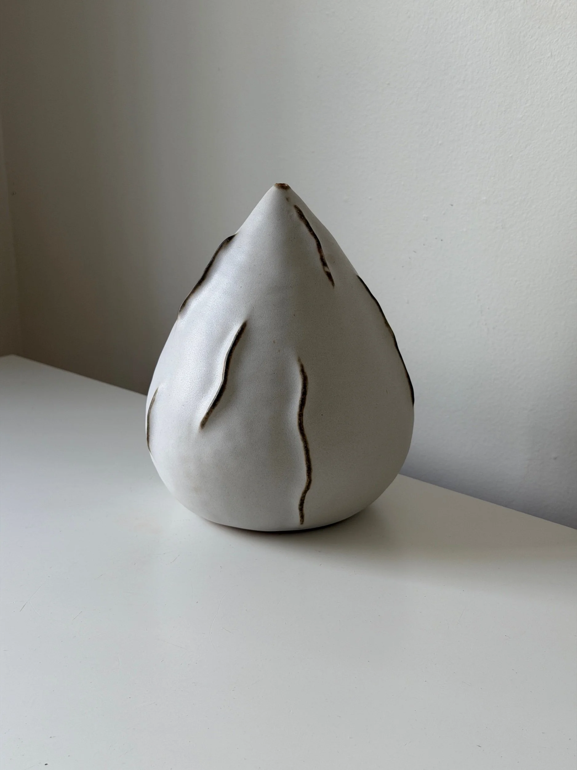 This sculptural ceramic vase is shaped by hand, allowing the form to emerge through an intuitive process rather than a fixed design. Its soft, organic silhouette and a quiet sense of movement, shifting depending on the light and angle.
