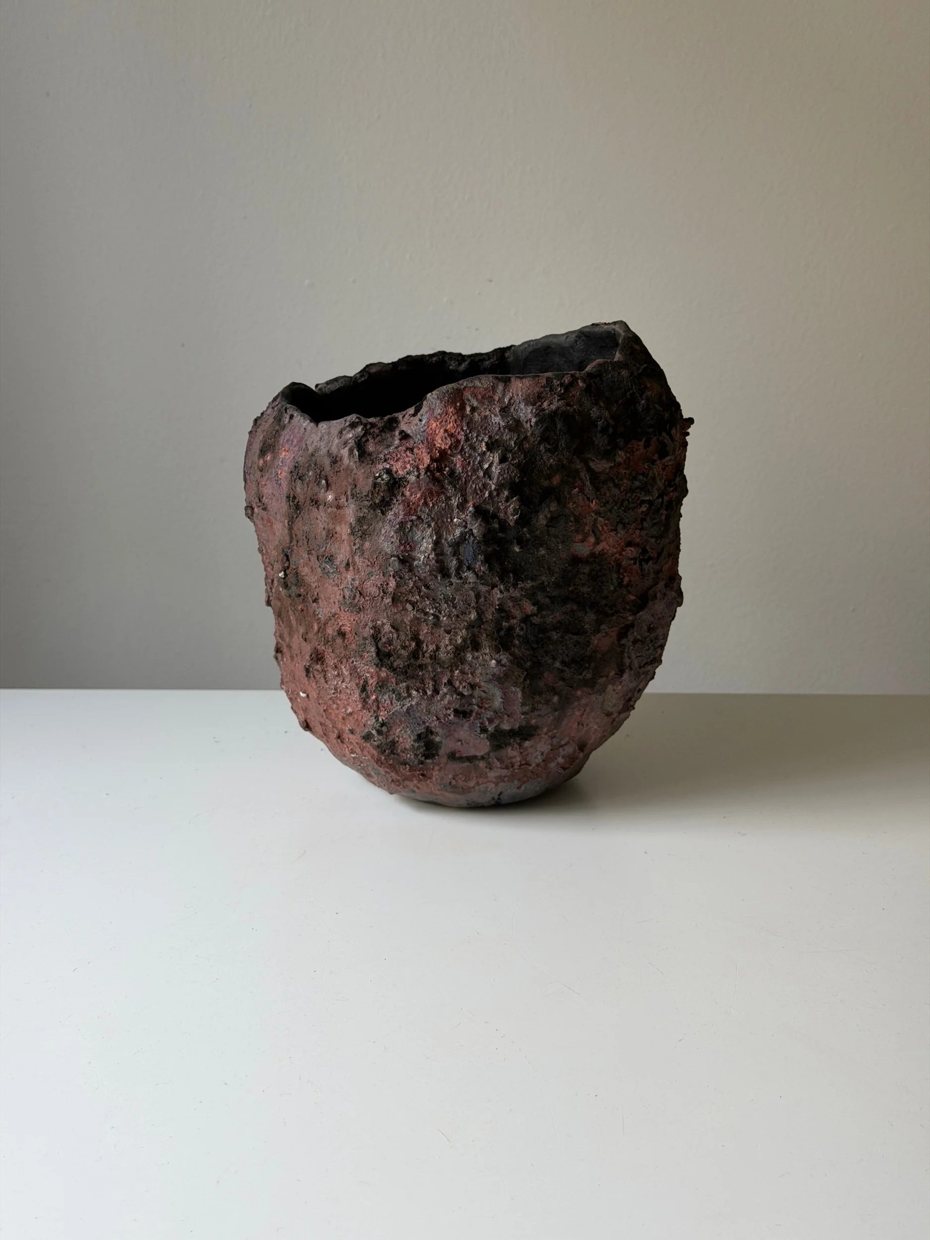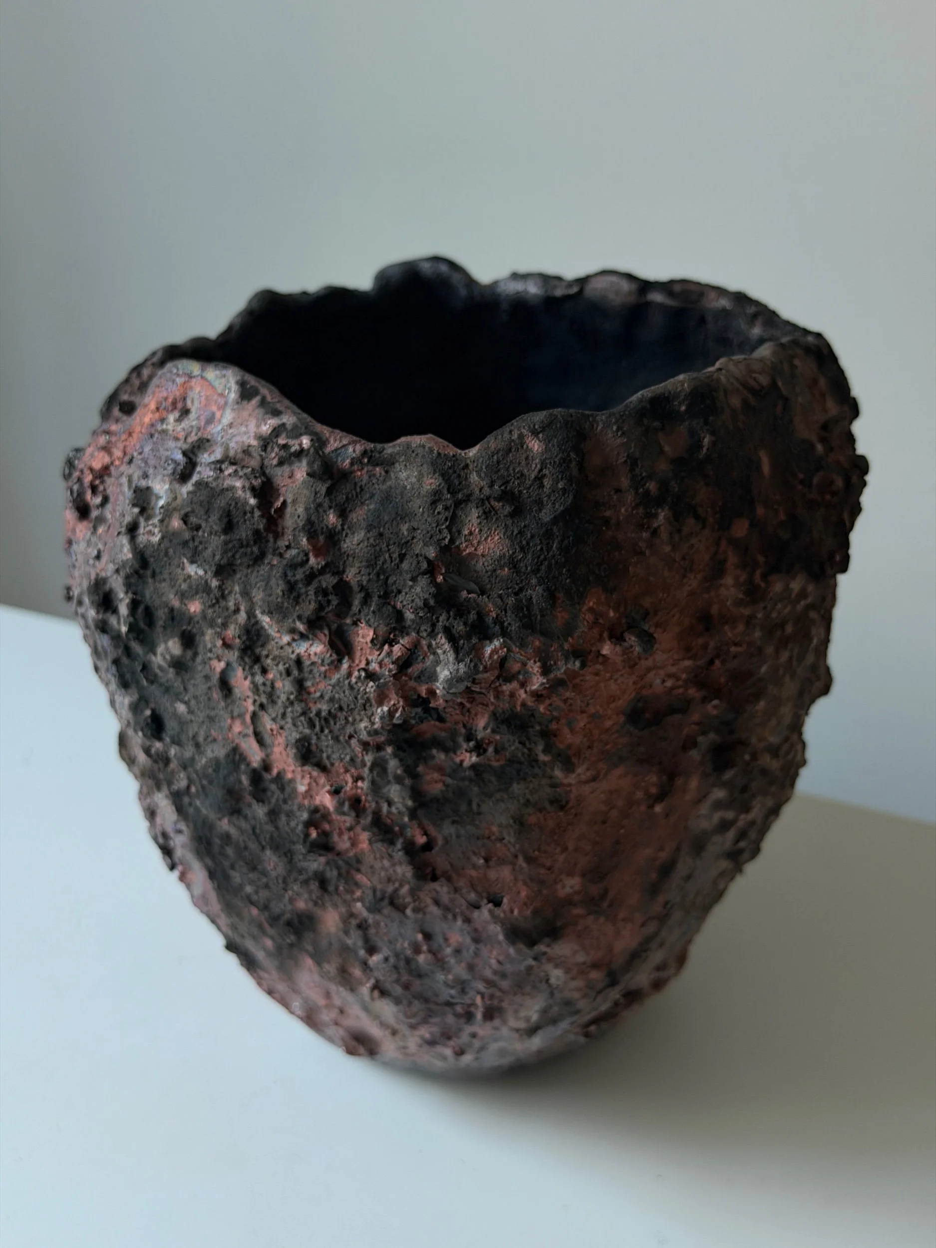 A one-of-a-kind ceramic vase created using the ancient Japanese raku firing technique. The surface is deeply textured, with rich tones ranging from warm copper to deep charcoal and subtle metallic flashes formed during the firing process.