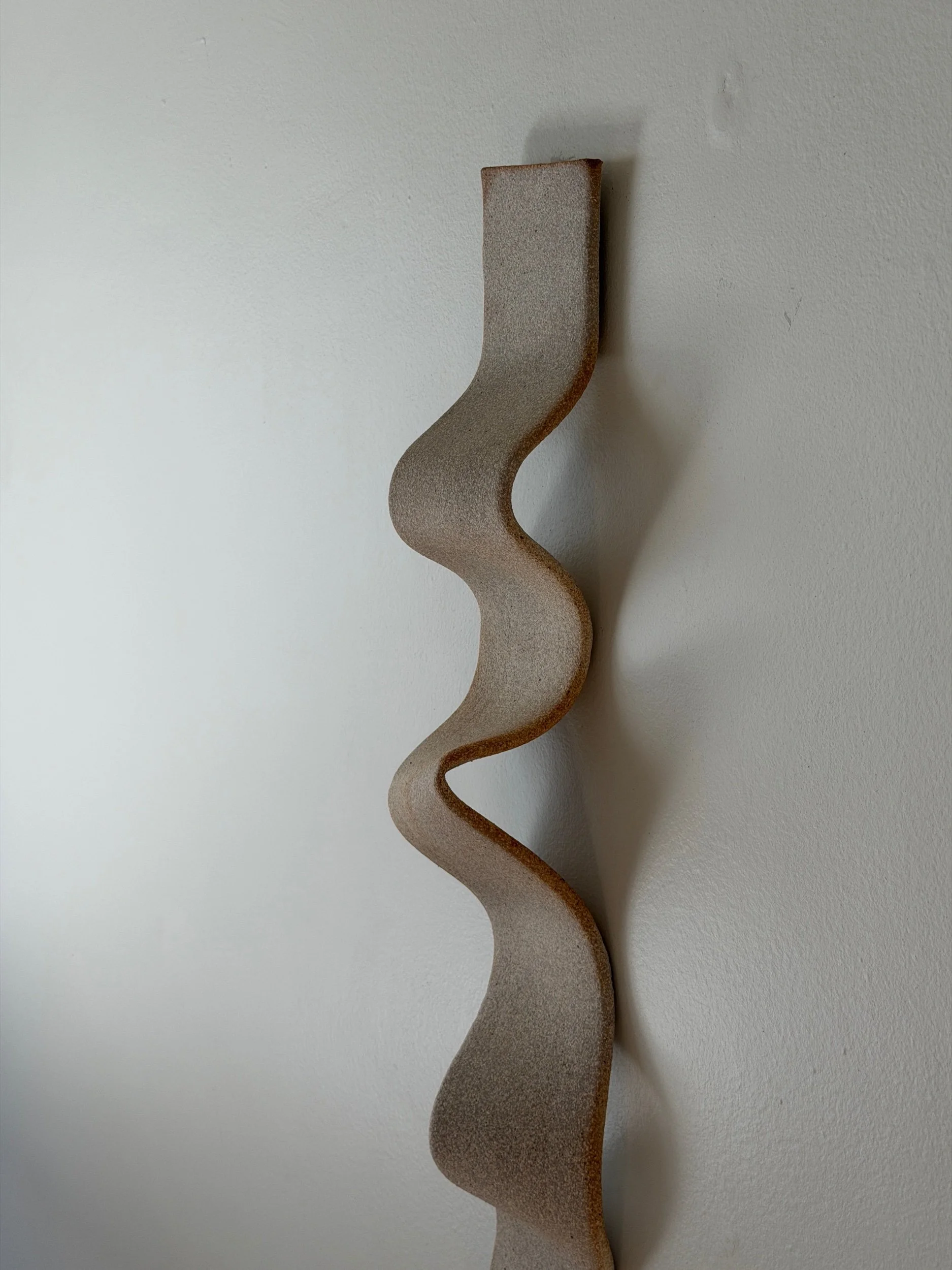 A single ribbon of stoneware moving down the wall like a line drawn in air, caught mid-motion. The form is restrained and rhythmic, equal parts stillness and flow.